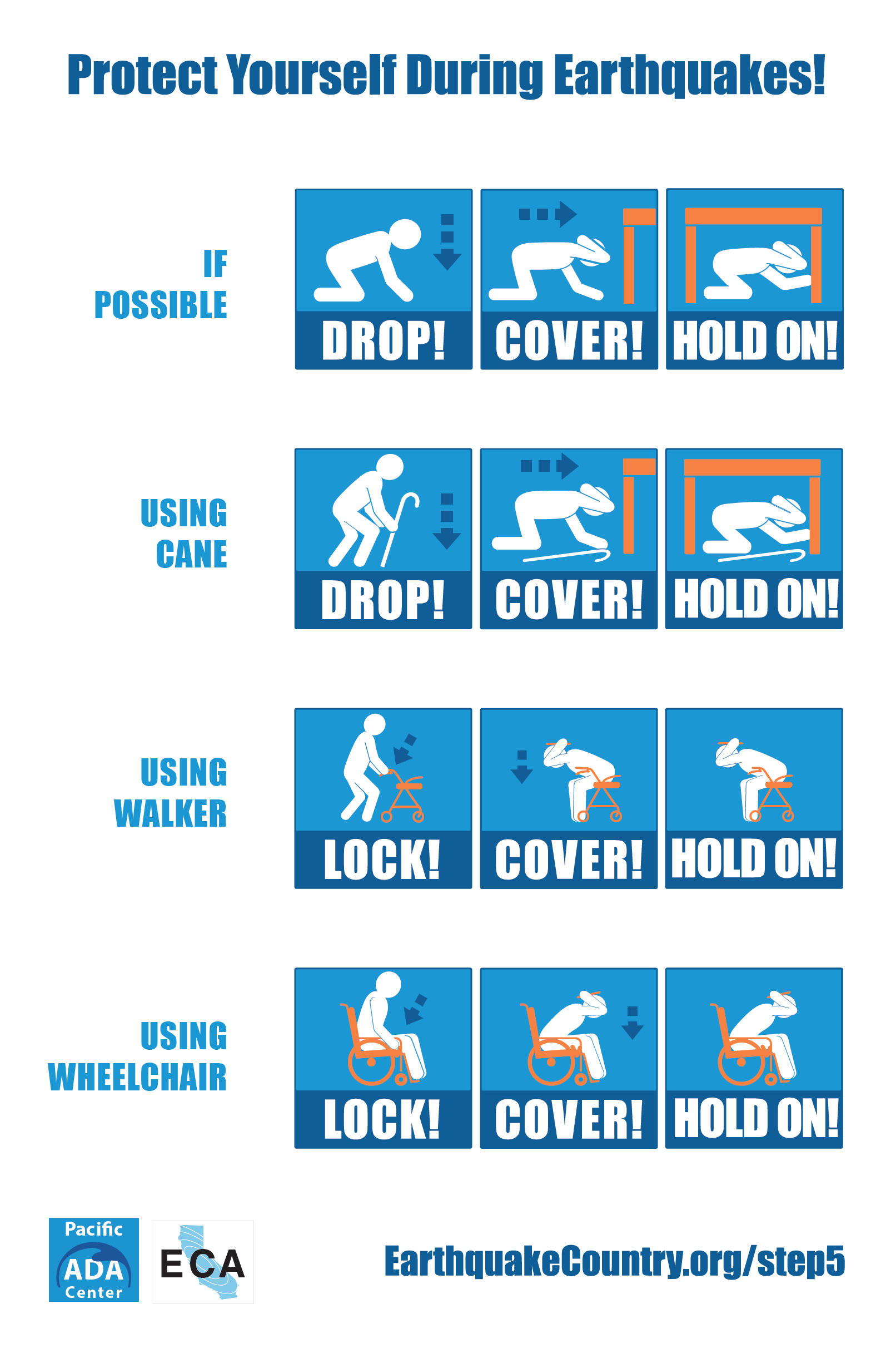 Persons with Disabilities: See EarthquakeCountry.org/disability for recommendations for people who use wheelchairs, walkers, or are unable to drop to the ground and get up again without assistance.